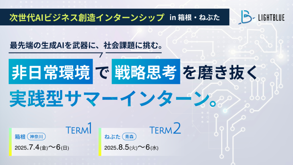次世代AIビジネス創造インターンシップ in 箱根・ねぶたは最先端の生成AIを武器に、社会課題に挑む。非日常環境で戦略思考を磨き抜く実践型サマーインターンです。